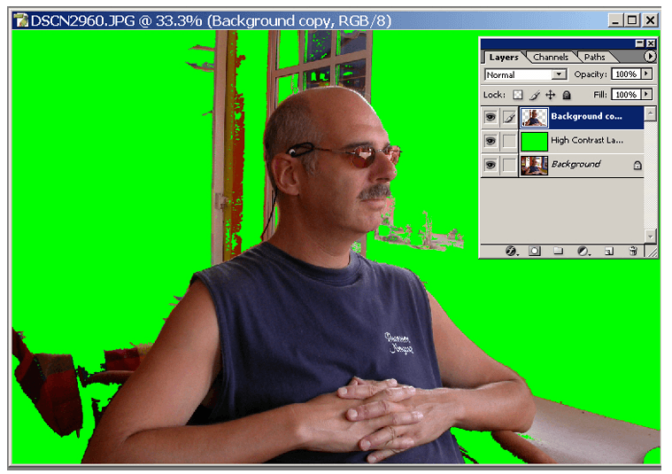 When masking images such as the one above, add a high-contrast layer beneath the one you are working on. It will help you define the edge and will show areas that have not been properly masked. This helps tremendously when masking complicated shapes such as hair.